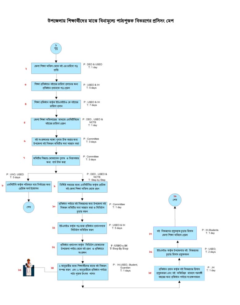 | উপজেলা মাধ্যমিক শিক্ষা অফিস | উপজেলা মাধ্যমিক শিক্ষা অফিসার, সহকারী উপজেলা মাধ্যমিক শিক্ষা অফিসার | উপজেলা মাধ্যমিক শিক্ষা অফিস | প্রতি বছর ডিসেম্বর মাসের মধ্যে, তবে বিতরণের কাজ শেষ হওয়ার সময়ের সাথে উপজেলায় পুস্তক পৌছার বিষটি জড়িত |